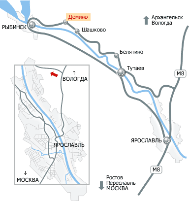 Далее через Ярославль: по Московскому проспекту через Которосльный мост до центра города; далее через площадь Богоявления, площадь им. Ф. Волкова, Красную площадь, Октябрьскую площадь; через Волжский мост в направлении Вологды: выезд из Ярославля через поселок Кузнечиха. После Кузнечихи поворот налево по указателям "Тутаев. Центр спорта и отдыха "Демино". Рыбинск". Через деревню Демино, до указателя "Лыжный стадион". Далее - налево. От Ярославля до Центра спорта и отдыха "Демино" - 75 км.